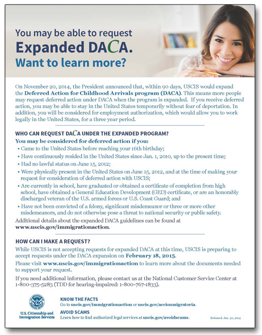 While USCIS is not accepting requests for expanded DACA at this time, USCIS is preparing to accept requests under the DACA expansion on February 18,2015.